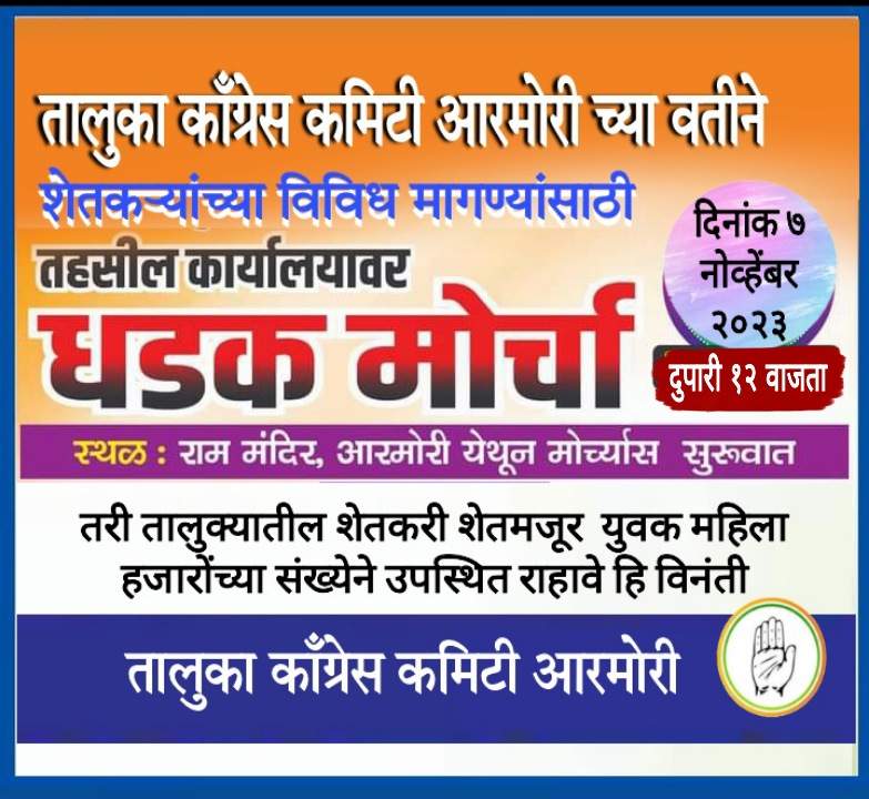 आरमोरी – गडचिरोली जिल्हयातील आरमोरी तालुका हा प्रगतशील तालुका असला तरी तालुक्यातील शेतकरी नागरिक, भूमिहीन, महिला, युवक आणि सर्वसामान्य नागरिक विविध समस्यांशी त्रस्त असुन त्यांचे तात्काळ निराकारण करण्यात यावे, या न्याय हक्काच्या मागण्यांसाठी तालुका काँग्रेस कमिटीच्या वतीने दिनांक ७ नोव्हेंबर २०२३ ला दुपारी ठीक १२ वाजता राममंदिर ते आरमोरी तहसिल कार्यालयावर मोर्चा धडकणार आहे