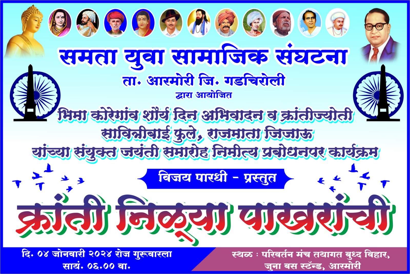 समता युवा सामाजिक संघटना आरमोरीच्या वतीने भिमा कोरेगांव शौर्य दिन अभिवादन व क्रांतीज्योती सावित्रीबाई फुले, राजमाता जिजाऊ यांच्या संयुक्त जयंती समारोह निमीत्य दिनांक ४ जानेवारीला सायंकाळी ६ वाजता विजय पारधी यांचा “क्रांती निळ्या पाखराची, हा प्रबोधनपर संगीतमय कार्यक्रम आरमोरी जूना बसस्थानक जवळील तथागत बुद्ध विहाराच्या परिवर्तन मंच सभागृहात होणारं आहे.