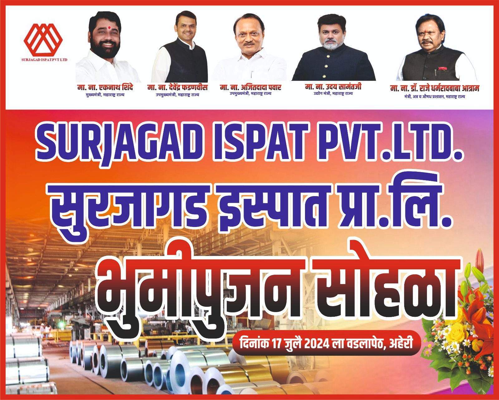 स्टील प्लांट प्रकल्पाचे भूमिपूजन १७ जुलै २०२४ रोजी होणार आहे. या कार्यक्रमाला अजितदादा पवार, उपमुख्यमंत्री आणि वित्त व नियोजन मंत्री यांच्यासह अनेक मान्यवर उपस्थित राहतील; उदय सामंत, उद्योगमंत्री आणि डॉ. धर्मरावबाबा आत्राम, अन्न आणि औषध प्रशासनाचे मंत्री. सोबतच या महत्त्वाच्या सोहळ्याला अनेक शासकीय अधिकारीही उपस्थित राहतील अशी अपेक्षा आहे.