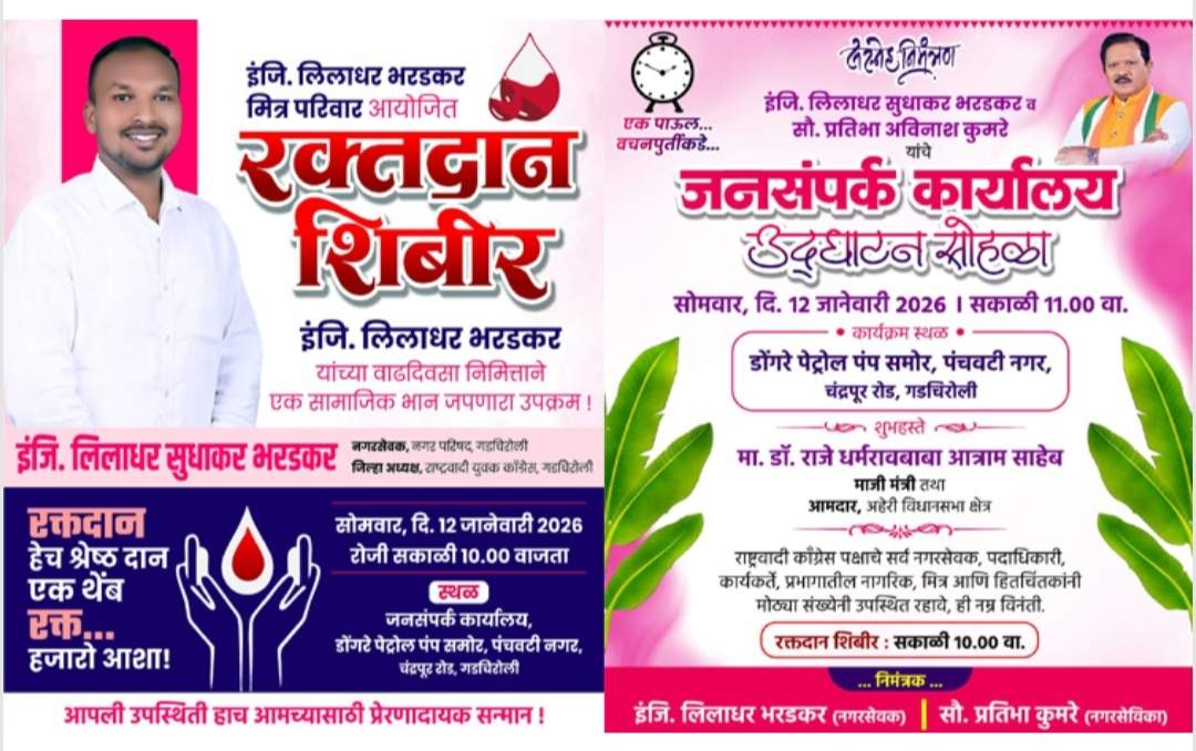 गडचिरोली : राजकारणाकडे समाजकारणाचे माध्यमम्हणून बघणारे नेतृत्व, गडचिरोली नगर परिषदेचे नगरसेवक तथा राष्ट्रवादी युवक काँग्रेसचे जिल्हाध्यक्ष इंजि. लिलाधर सुधाकर भरडकर यांच्या वाढदिवसानिमित्त सोमवार, १२ जानेवारी रोजी गडचिरोली शहरात विविध सामाजिक उपक्रमांची मांदियाळी पाहायला मिळणार आहे. यानिमित्ताने भव्य रक्तदान शिबीर आणि जनसंपर्क कार्यालयाचा उद्घाटन सोहळा आयोजित करण्यात आला असून, हा सोहळा जिल्ह्याच्या राजकीय व सामाजिक वर्तुळात चर्चेचा विषय ठरला आहे.