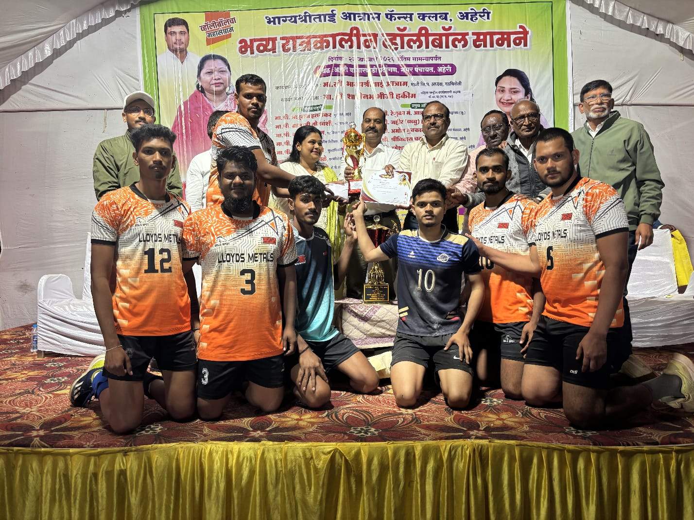 गढ़चिरौली : जिले के अहेरी में आयोजित भव्य राज्य स्तरीय वॉलीबॉल प्रतियोगिता में लॉयड्स वॉलीबॉल टीम ने अपने शानदार प्रदर्शन से सभी का दिल जीत लिया। महाराष्ट्र की दिग्गज टीमों को कड़ी टक्कर देते हुए लॉयड्स की टीम ने उपविजेता (Runner-up) का खिताब अपने नाम किया। फाइनल मुकाबले में ‘नागपुर ऑरेंज सिटी’ ने प्रथम स्थान प्राप्त कर विजेता की ट्रॉफी उठाई।