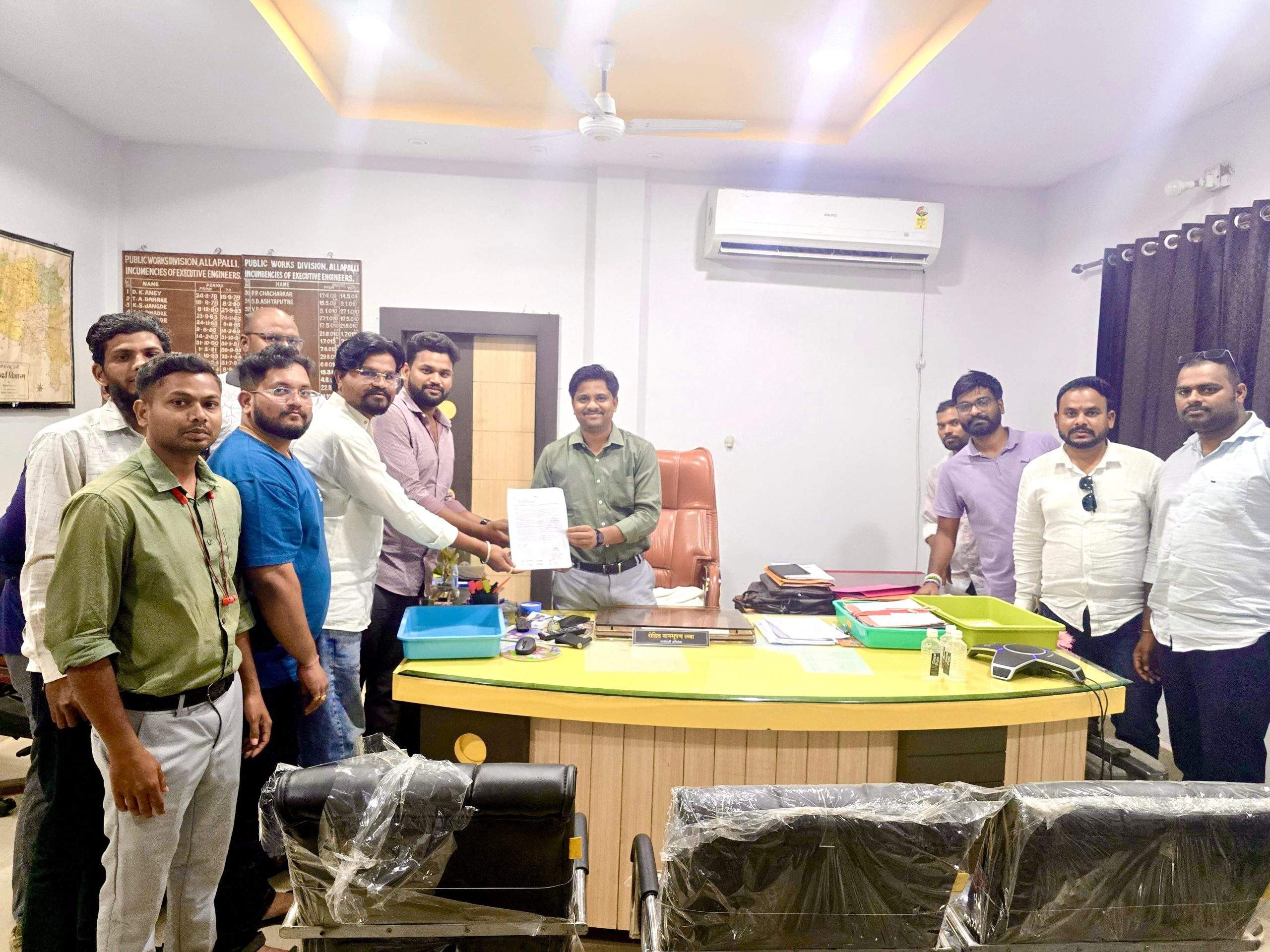 दरम्यान, १२ मार्च २०२६ रोजी संघटनेच्या वतीने Public Works Department Maharashtra च्या आलापल्ली येथील कार्यकारी अभियंत्यांना निवेदन देण्यात आले. या निवेदनात शासन निर्णयानुसार सुशिक्षित बेरोजगार अभियंता कंत्राटदारांसाठी राखीव असलेल्या ३३ टक्के कामांच्या कोट्याची काटेकोर अंमलबजावणी करावी, तसेच टेंडर प्रक्रियेत पारदर्शकता ठेवून स्थानिक सुशिक्षित अभियंत्यांना न्याय द्यावा, अशी मागणी करण्यात आली.