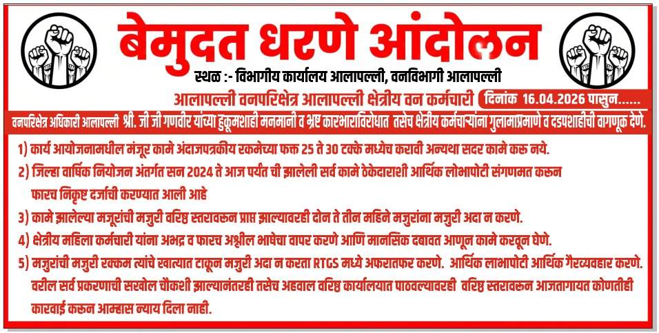📍गडचिरोली : आलापल्ली वनविभागात मोठी खळबळ उडाली असून, वनपरिक्षेत्र कार्यालयातीलच क्षेत्रीय वन कर्मचाऱ्यांनी आपल्या वरिष्ठ अधिकाऱ्यांविरोधात बेमुदत धरणे आंदोलन सुरू केले आहे. भ्रष्टाचार, दडपशाही आणि आर्थिक गैरव्यवहाराचे गंभीर आरोप करत कर्मचाऱ्यांनी आंदोलनाचा मार्ग अवलंबला आहे.