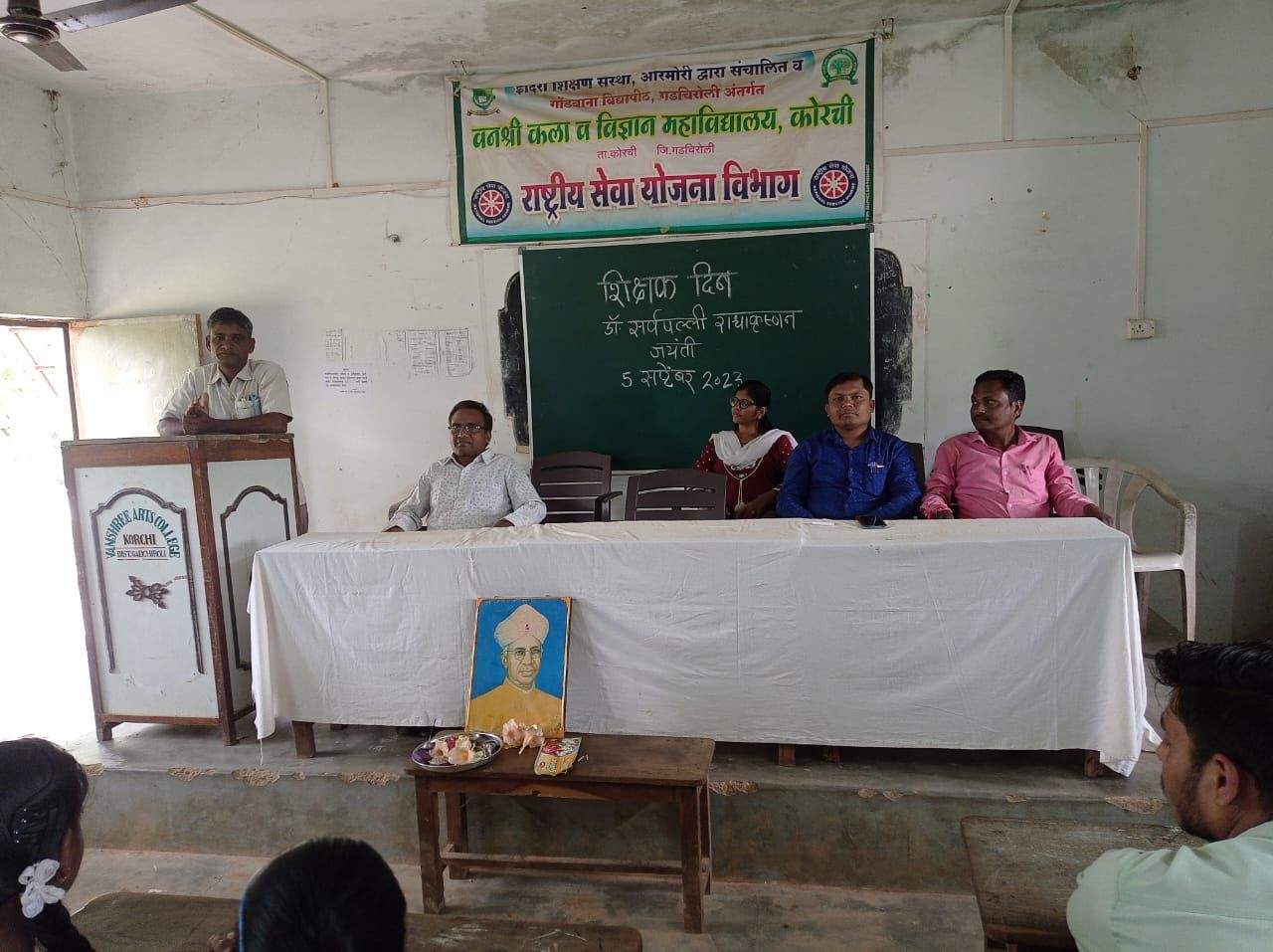 स्थानिक वनश्री कला व विज्ञान कनिष्ठ व वरिष्ठ महाविद्यालय कोरची येथ आज दिनांक ५ सप्टेंबर २०२३ रोजी डॉ. सर्वपल्ली राधाकृष्णन यांची जयंती शिक्षक दिन म्हणून सजरा करण्यत आले. या कार्यक्रमाच्या अध्यक्षस्थानी प्रा. जी. टी. देशमुख होते तर प्रमुख अतिथि म्हणून प्रा. महेश्वर बंसोडे, प्रा. संतराम धिकोडी, प्रा किशोर वालदे, प्रा. जितेंद्र विनायक, प्रा. कु. जुली बाराहाते, प्रा. नीलकंठ फूंडे आदी उपस्थित होते.