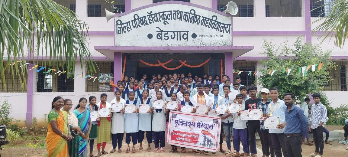 जिल्हा परिषद हायस्कूल तथा कनिष्ठ महाविद्यालय बेडगाव येथे मुक्ति पथ यांच्या वतीने मॅरेथॉन स्पर्धा आयोजित करून शालेय विद्यार्थ्यांना शालेय परिसर तंबाखू मुक्त ठेवण्याचा संकल्प देण्यात आला. स्पर्धेत प्रथम, द्वितीय व तृतीय क्रमांक व सहभागी सर्व विद्यार्थ्यांना प्रमाणपत्र व मेडल देऊन गौरविण्यात आले. या प्रसंगी व्यसन मुक्ती पथक तालुका समन्वयक श्रीमती निळा कन्नाके, प्राचार्या आशा सोनकुसरे, श्रीमती प्रतिभा प्रधान शा.व्य.स. अध्यक्ष, प्रा. गणेश सोनकलंगी, क्रिडा शिक्षक श्रीहरी उसेंडी ,विजय मसराम मनोज बन्सोड , काजल मडावी, प्रा. श्रुती भैसारे, विद्या उंबरकर, राकेश गायकवाड , मेघश्याम कोसरे सर, नेहा लीमजे ,शिला कुमरे ,जिजा खूणे उपस्थित होते.